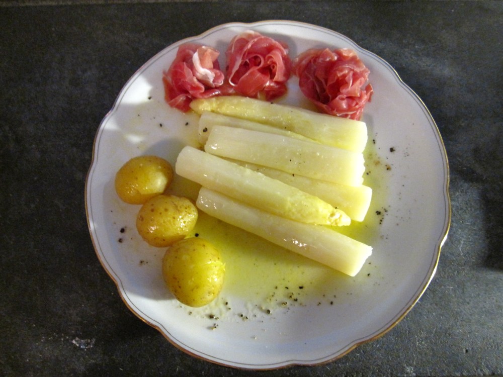 Zuerst werden die Kartoffeln in der Schale aufgesetzt, da sie am längsten brauchen. Dann wird der Spargel geschält und mit dem Saft einer halben Zitrone beträufelt, damit er nicht bräunt. Den Spargel in einen Topf geben, Wasser dazugeben, bis der Spargel bedeckt ist und ein wenig Butter hinzufügen. Das Ganze kurz aufkochen und dann dahinköcheln lassen, bis der Spargel gar, aber noch bissfest ist. Je nach Dicke des Spargels kann dies unterschiedlich lange dauern.