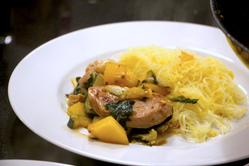 Schritt 5: Die gebratenen Nudeln mit dem Mango-Schweinefilet anrichten. Man kann etwas Sesamsamen oder auch frischen Koriander darüber streuen. Je nachdem was man zur Verfügung hat.