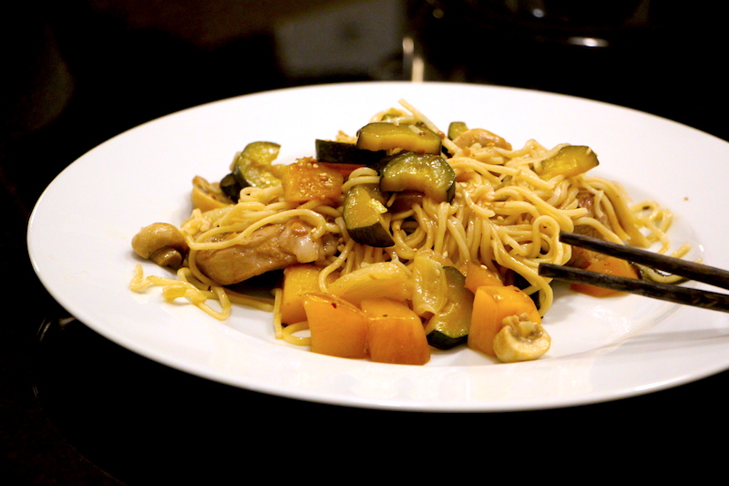 Da uns einiges von dem Gericht übrig blieb, die Nudeln aber aus waren, haben wir tags darauf eine zweite Auflage mit angebratenen chinesischen Eiernudeln zubereitet, die ebenfalls köstlich war.