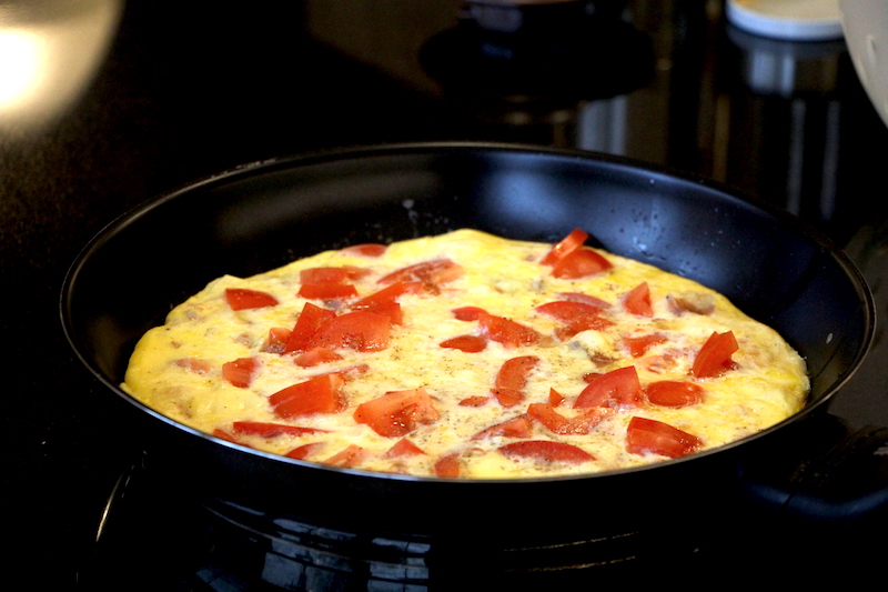 Schinken fein schneiden und in einer Pfanne Butter etwas anbraten. Gewürfelten Paprika und halbierte Tomaten dazugeben, kurz mitbraten und das Eigemisch darübergießen.