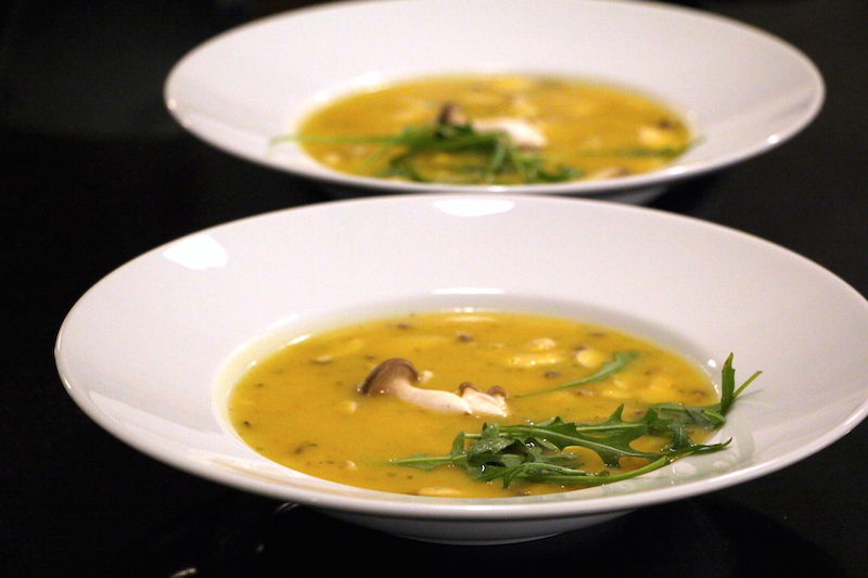 Manchmal kann man verschiedene Jahreszeiten miteinander verbinden, oder wenigstens in der eigenen Vorstellung so tun, als ob der Herbst den Frühling trifft. Erdäpfelsuppe mit kräftigem Majoran-Aroma gehört für Markus zum Herbst, zu diesem herbstlichen Geschmack passen frische Kräuterseitlinge, die aber für einen Pilz recht intensiv nach Frühling schmecken. Gibt man dazu noch etwas Rucola, ist die Jahreszeitenmelange perfekt. Nicht nur der Farbe wegen, sondern auch wegen des Geschmacks haben wir diese Suppe mit Kurkuma gewürzt.