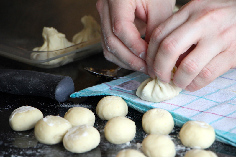 Schritt 4: 2 gehäufte Teelöffel der Hühnerfleischfülle auf jeden Teigkreis aufhäufen. Rundherum den Teig mit etwas Wasser bestreichen, zusammenklappen und ein wenig eindrehen, sodass ein schönes Wirbelmuster entsteht. Die Teigtaschen in einer leicht eingefetteten Pfanne auflegen und im Dampfgarer für 15 Minuten dämpfen.