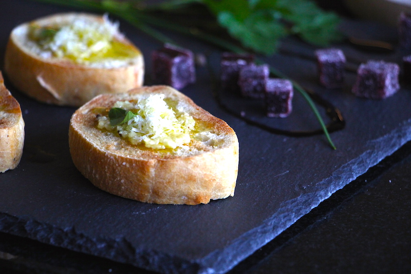 Eine Knoblauchzehe schälen und durch eine Knoblauchpresse drücken. Mit etwas Olivenöl und Zitronensaft zu einer Paste vermischen. Mit Salz und Pfeffer abschmecken. Basilikumblätter waschen, Parmesan reiben und Weißbrot in Scheiben schneiden. Unmittelbar vor dem Servieren die Weißbrotscheiben toasten. Wir finden, dass dies im Toaster sehr gut funktioniert, wer möchte, kann aber auch den Backofen anwerfen – vor allem bei größeren Mengen ist dies sinnvoll. Nun die Knoblauchpaste auf den Scheiben verteilen, mit Parmesan bestreuen und mit Basilikumblättern dekorieren. Wer möchte, kann die Bruschette nun noch mit etwas Olivenöl und/oder Zitronensaft beträufeln.