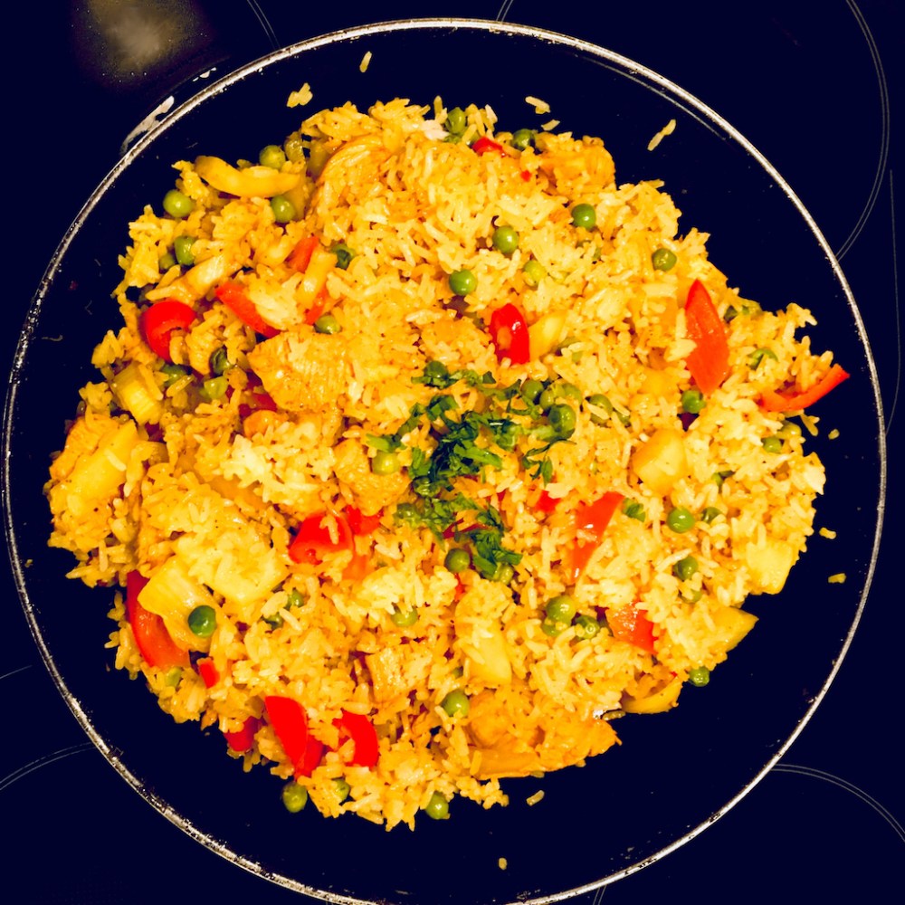 Schritt 3: Hühnerfilet ebenfalls mit einem scharfen Messer zerteilen und mit etwas Currypulver einreiben. Öl in einer Pfanne oder einem Wok erhitzen und zunächst Currypulver – hier darf man ruhig großzügig sein – und dann die Hühnchenstücke darin scharf anbraten. Gemüse hinzufügen und mit ein wenig Sojasauce ablöschen. Reis unterheben und das Ganze mit Kreuzkümmel, Cayennepfeffer, Salz und eventuell noch etwas Currypulver abschmecken. Vor dem Servieren mit den Kräutern bestreuen. Guten Appetit!