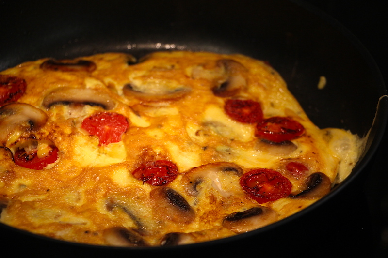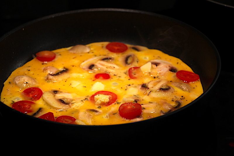 Die Eier aufschlagen, verquirlen und mit Salz und Pfeffer abschmecken. Etwas Käse reiben und hinzugeben. Tomaten und Pilze waschen und in feine Scheiben aufschneiden. In einer Pfanne Butter oder Olivenöl erhitzen, die Eiermasse hineingeben und das Gemüse drauflegen. Einige Minuten anbraten lassen, dann wenden und noch einmal kurz weitergaren lassen. Sobald das Ganze gestockt ist und eine schöne, goldgelbe Farbe aufweist, können die Teller schon bereit gestellt werden. Dazu passt z.B. ein grüner Salat.
